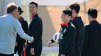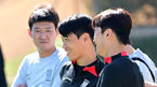 [OSEN=도하(카타르), 지형준 기자] 대한민국 축구대표팀이 21일(현지시간) 카타르 도하 알 에글라 트레이닝 센터에서 훈련을 가졌다.클린스만 감독이 훈련에 앞서 황희찬, 손흥민과 이야기를 나누고 있다. 2024.01.21 / jpnews.osen.co.kr