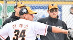 [OSEN=멜버른(호주), 박준형 기자] 한화 이글스가 5일 호주 빅토리아주 멜버른에 위치한 멜버른볼파크에서 스프링캠프를 진행했다.한화 최원호 감독이 불펜 마친 김기중과 이야기를 나누고 있다. 2024.02.05 / soul1014@osen.co.kr