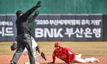 [OSEN=부산, 이석우 기자] 9일 부산 사직구장에서 2024 신한 SOL 뱅크 KBO 리그 롯데 자이언츠와 SSG 랜더스의 경기가 열렸다. SSG 랜더스 오태곤이 7회초 1사 1루 이지영 타석때 2루 도루 시도했으나 오버런으로 롯데 자이언츠 노진혁에