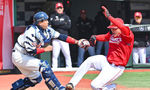 [OSEN=부산, 이석우 기자] 9일 부산 사직구장에서 2024 신한 SOL 뱅크 KBO 리그 롯데 자이언츠와 SSG 랜더스의 경기가 열렸다. SSG 랜더스 전의산이 4회초 1사 1,2루 한유섬의 중견수 플라이볼때 홈에서 롯데 자이언츠 유강남에게 태그