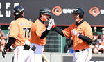 [OSEN=대전, 최규한 기자] 9일 대전 한화생명이글스파크에서 ‘2024 신한은행 SOL KBO리그’ 시범경기 한화 이글스와 삼성 라이온즈의 경기가 열렸다.4회말 무사 선두타자로 나선 한화 이재원이 좌월 솔로포를 날리고 이진영과 인사
