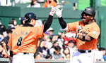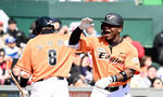 [OSEN=대전, 최규한 기자] 9일 대전 한화생명이글스파크에서 ‘2024 신한은행 SOL KBO리그’ 시범경기 한화 이글스와 삼성 라이온즈의 경기가 열렸다.4회말 1사 3루 상황 한화 페라자가 달아나는 우월 투런포를 날리고 홈을 밟은 뒤