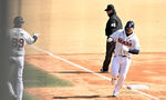 [OSEN=이천, 조은정 기자]9일 이천 베어스파크에서 ‘2024 신한은행 SOL KBO리그’ 두산 베어스와 키움 히어로즈의 시범경기가 열렸다.1회말 1사 1루 두산 김재환이 역전 투런 홈런을 날린 뒤 환영을 받고 있다. 2024.03.09 /cej@osen.co.kr