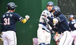 [OSEN=부산, 이석우 기자] 11일 부산 사직구장에서 2024 신한 SOL 뱅크 KBO 리그 롯데 자이언츠와 두산 베어스의 시범경기가 열렸다. 두산 베어스 박준영이 3회초 좌측 폴대 맞추는 솔로 홈런을 치고 하이파이브를 하고 있다. 2024.03.11 /