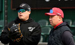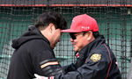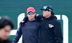 [OSEN=대전, 최규한 기자] 11일 대전 한화생명이글스파크에서 ‘2024 신한 SOL Bank KBO리그’ 시범경기 한화 이글스와 KIA 타이거즈의 경기가 열린다.경기를 앞두고 한화 류현진과 KIA 이범호 감독이 대화를 나누고 있다. 2024.03.10 / dreame