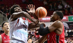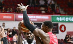 [OSEN=안양, 김성락 기자] 7일 오후 안양 동안구 정관장 아레나에서 '2024-2025 KCC 프로농구' 정관장 레드부스터스와 KT 소낙붐의 경기가 열렸다. 이날 정관장전에서 KT 하윤기가 무릎 부상으로 결장했다.1쿼터 KT 해먼즈가 돌파를 시도