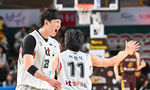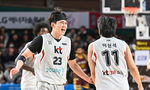 [OSEN=창원, 이석우 기자] 28일 창원 체육관에서 2024-2025 KCC 프로농구 창원 LG와 수원 KT의 경기가 열렸다. 6연승 LG와 3연승 KT가 연승을 이어가기 위해 맞대결을 펼친다.수원 KT 박준영이 3점슛을 성공시키고 최진광과 하이파이브를