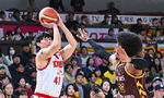 [OSEN=수원, 조은정 기자]1일 오후 수원 KT 아레나에서 '2024-2025 KCC 프로농구' 수원 KT 소닉붐과 부산 KCC 이지스의 경기가 열렸다.KT는 13승 10패로 공동 3위를, KCC는 10승 13패로 7위를 기록하고 있다.2쿼터 KT 하윤기가 슛동작 중 팡루을