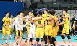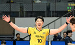 [OSEN=장충, 이대선 기자] KB손해보험이 26일 장충체육관에서 열린 서울 우리카드와 경기에서 세트스코어 3-0(25-23/25-23/25-21)으로 이겼다.경기 종료 후 KB손해보험 나경복이 승리의 기쁨을 나누고 있다. 2025.01.26 / sunday@osen.co.kr