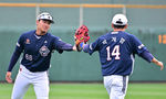 [OSEN=미야자키(일본), 지형준 기자] 두산 베어스가 25일 일본 미야자키 산마린 스타디움에서 일본프로야구 세이부 라이온스와의 구춘대회 첫 경기를 가졌다.이날 두산은 세이부에 3-6으로 패했다. 두산 박찬호, 최원준, 양의지가
