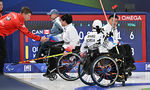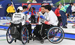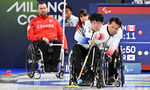[OSEN=조은정 기자]휠체어컬링 남봉광(가운데)가 12일(현지시간) 이탈리아 코르티나담페초 컬링 올림픽 스타디움에서 열린 2026 밀라노 코르티나 패럴림픽 휠체어컬링 혼성 4인조 캐나다와의 예선전에 3 대 6으로 패한 뒤 상대와