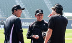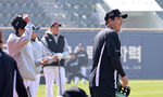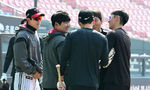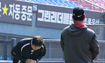[OSEN=잠실, 지형준 기자] 28일 서울 잠실야구장에서 2026 신한 SOL KBO리그 개막전 LG 트윈스와 KT 위즈의 경기가 열렸다. 이날 LG는 요니 치리노스, KT는 맷 사우어를 선발로 내세웠다.KT 김현수가 친정팀 LG 선수들의 훈련을 지켜보고