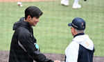 [OSEN=대전, 이대선 기자] 1일 대전 한화생명볼파크에서 2026 신한 SOL KBO리그 한화 이글스와 KT 위즈의 경기가 열렸다.이날 한화는 류현진, KT는 고영표를 선발로 내세웠다.경기에 앞서 KT 장진혁이 한화 김경문 감독과 인사를 하고