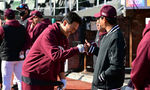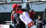 [OSEN=잠실, 조은정 기자] 2일 서울 잠실야구장에서 2026 신한 SOL KBO리그 LG 트윈스와 KIA 타이거즈의 경기가 열린다. 이날 LG는 웰스, KIA는 김태형을 선발로 내세웠다. KIA 올러가 훈련 중 코칭스태프를 들어올리고 있다. 2026.04.02 /cej@os