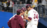 [OSEN=고척, 이대선 기자] 5일 서울 고척스카이돔에서 2026 신한 SOL KBO리그 키움 히어로즈와 LG 트윈스의 경기가 열렸다.이날 키움은 와일스, LG는 톨허스트를 선발로 내세웠다.4회초 무사 1루에서 마운드를 방문한 키움 포수 김건희