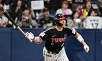 [OSEN=고척, 이대선 기자] 5일 서울 고척스카이돔에서 2026 신한 SOL KBO리그 키움 히어로즈와 LG 트윈스의 경기가 열렸다.이날 키움은 와일스, LG는 톨허스트를 선발로 내세웠다.4회초 무사에서 LG 천성호가 중전 안타를 치고 환호하