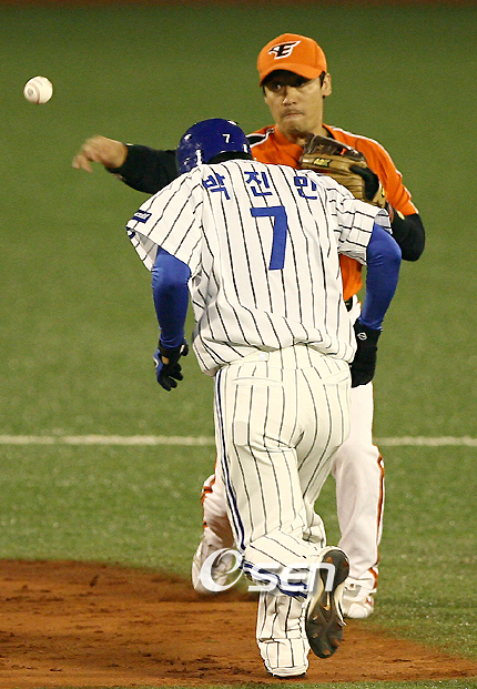 야구 속설 중에 ‘위기 다음에 찬스-찬스 다음에 위기’라는 말이 있습니다. 실점 위기를 넘기면 이상하게도 곧이어 공격에서 득점 기회를 맞는다는 이야기입니다. 거꾸로 득점 기회를 놓치면 곧바로 다음 수비 때 실점 기회를 제공한다는 이야기도 됩니다. 위의 속설은 야구에서 흔히 볼 수 있는 현상인데 수 십 년 간 야구 경기를 관전한 제가 가장 기억에 남는 속설에 걸맞는 경기는 2000년 시드니 올림픽서 우리나라와 일본의 예선전 마지막 경기였습니다. 한국은 마쓰자카를 상대로 1회초에 김동주의 2루타, 이승엽의 투런 홈런 등으로 4점을 먼저 뽑아 쉽게 이기는 듯했으나 정민태-구대성이 이어 던지며 9회초까지 5-5 동점을 이루었습니다. 그리고 9회말 수비에서 2사 1,2루 때 다구치에게 우전안타를 맞았습니다. 본래 중견수였다가 3회부터 우익수로 나선 이병규는 이 타구를 제 자리에서 한 걸음 달려나와 잡았는데 2루에서 쏜살같이 홈으로 대시하는 주자를 잡기에는 벅차 보였습니다. 끝내기 적시타로 점수를 내줘 결선 진출이 좌절될 것 같은 순간이었습니다. 더구나 이병규가 국내 무대서 보여준 외야 송구 실력은 썩 좋지는 않았습니다. 그러나 이병규는 공을 잡자마자 사력을 다해 던졌고 이 송구는 홈플레이트를 지키고 있던 포수 홍성흔에게 정확히 직결돼 2루주자 헤이마를 극적으로 태그아웃 시킬 수 있었습니다. 망연자실한 표정의 일본 선수단은 믿어지지 않는다며 고개를 절래절래 흔들었고 한국 선수단의 환호성은 하늘을 찌를 듯했습니다. 사기가 충천한 한국은 곧이어 10회초 실책으로 출루에 성공한 다음 김기태의 안타와 이승엽의 적시타, 정수근의 희생타로 2점을 뽑고 10회말 임창용이 1점으로 막아 7-6으로 승리하고 4강에 올라가 다시 일본과 대결, 마쓰자카를 상대로 3-1로 이겨 동메달을 따냈습니다. 시드니 올림픽 일본전에 이어 생각나는 경기는 지난해 3월 월드베이스볼클래식(WBC)대회 아시아라운드서 일본에게 역전승을 거둔 장면입니다. 우익수 이진영(SK)은 1차전 대만전 3회 2사 2루에서 린즈성의 파울타구를 전력질주해 펜스에 부딪치며 잡아낸 데 이어 8회에도 린즈성의 우전안타성 타구를 슬라이딩 캐치하며 앞구르기를 해 찬사를 받았습니다. 2-0승. 또 이진영은 3차전인 일본전에서 0-2로 뒤진 4회말 2사 만루 때 니시오카의 우익수 왼쪽으로 빠지는 날카로운 타구를 혼신의 힘을 다해 쫓아가 역모션으로 몸을 날려 낚아채며 한 바퀴 구르는 묘기를 연출했습니다. 타구가 빠지면 3점을 한꺼번에 내줘 절망적일 상황에서 이진영의 수비는 한국 선수들에게 힘을 주어 5회에 한 점을 추격하고 8회에는 1사 1루에서 이승엽이 결승 투런 홈런을 뿜어 3-2로 역전승, 아시아 1위로 본선에 출전했습니다. 이진영에겐 '국민 우익수'라는 호칭이 붙었죠. 이번 준플레이오프 1차전에서 한화 이글스는 ‘위기 다음에 찬스’를 살려 5-0으로 넉넉하게 낙승했습니다. 지난 9일 대전에서 열린 경기에서 삼성 라이온즈가 1회초 1사 1, 2루, 2회초 1사 1, 2루의 기회를 잇달아 잡았으나 후속타자들이 연거푸 삼진으로 물러나자 2회말 공격에서 이범호가 2루타를 때리고 연경흠이 우전 적시타를 날려 선취점을 뽑았습니다. 4회초에도 삼성이 1사 후 김한수의 2루타로 득점권에 나갔으나 점수를 얻지 못하자 한화는 4회말 김태균이 솔로 홈런을 날려 2-0으로 앞섰습니다. 그리고 삼성은 0-3으로 뒤진 6회초엔 심정수의 볼넷, 박진만과 진갑용의 연이은 좌전안타로 무사 만루의 황금 기회를 잡았습니다. 그러나 이날 2안타를 때린 김한수가 짧은 우익수 앞 범타로 물러난 데 이어 박정환과 강봉규는 류현진에게 잇따라 삼진을 먹어 한 점도 뽑아내지 못해 결국 영봉패를 당했습니다. 2~3점을 내줄 수 있었던 위기를 벗어난 한화는 6회말 크루즈의 안타에 이어 이범호가 투런 호머를 날려 승부에 쐐기를 박았습니다. 10일 대구에서 거행된 준플레이오프 2차전에서도 한화는 2회에 삼성 진갑용에게 솔로 홈런을 허용한 뒤 4회에는 김재걸에게 안타, 양준혁에겐 볼넷을 내줘 무사 1, 2루에서 심정수를 삼진으로 돌려 세운 다음 박진만에게 안타를 맞아 1사 만루의 위기를 맞았지만 구원투수 최영필이 진갑용을 2루수 앞 병살타로 막아내 커다란 위기를 넘겼습니다. 하지만 한화는 ‘위기 다음에 찬스’를 살리지 못하고 그후 공격에서 범타로 일관했고 삼성은 한화가 점수를 내지 못하자 6회말에 양준혁이 투런 홈런을 날려 승기를 잡으며 결국 6-0으로 대승해 전날 빚을 갚았습니다. 야구계의 속설 ‘위기 다음의 찬스’는 이렇게 맞을 수도 있고 맞지 않는 경우도 잦습니다. '홈런성 파울 다음에는 삼진’이라는 속설도 그렇습니다. 10여 년 전 강타자 강영수(삼성-OB-태평양-현대-쌍방울)가 잠실경기에서 홈런성 파울을 두 개 날린 다음에도 홈런을 치는 것을 보고 “속설이 맞지 않을 때도 있구나”하고 웃어 넘긴 적이 있는데 속설은 속설에 그치는 모양입니다. 10일 2차전 삼성의 4회말 1사 만루서 진갑용의 2루 땅볼 때 한화 유격수 김민재가 1루주자 박진만을 2루에서 포스아웃시킨 뒤 병살로 연결하며 실점 위기를 모면하는 장면.