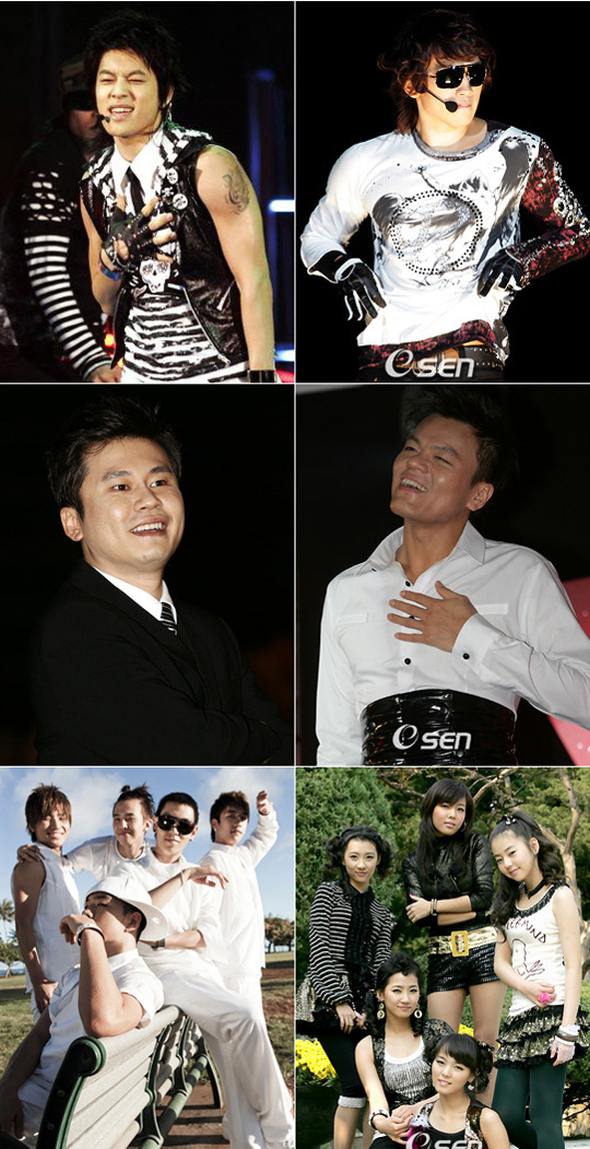 [OSEN=최영균의 인사이더] 양현석과 박진영의 라이벌 관계가 형성되고 본격적인 격돌이 벌어진 것은 2003년이었다. 물론 1990년대 양현석이 ‘서태지와 아이들’ 시절, 방송 차트 1위 자리를 놓고 솔로 가수였던 박진영과 맞붙은 적은 있지만 당시는 급이 달랐다. 둘이 가수를 그만 두고 제작자 겸 프로듀서로 직업을 바꾼 이후에도 god의 가장 대중적인 음악을 지휘한 박진영과 힙합을 추구했던 양현석은 충돌 없이 각자의 영역에서 입지를 다졌다. 2003년은 양현석의 세븐이 데뷔한 해다. 그리고 한 해 전에는 박진영의 비가 가요계에 등장했다. 비와 세븐은 유승준이 사라진 한국 가요계에서 최고의 남자 솔로 댄스 가수 자리를 놓고 맞닥트렸다. 양현석과 박진영은 지금도 자주 연락을 주고 받을 만큼 가까운 사이로 알려졌다. 하지만 비와 세븐 주변의 소속사 관계자들은 당시 서로에 대해 강한 라이벌 의식을 드러냈다. 거기다 비와 세븐은 내세울 강점이 서로 비슷해 라이벌 구도는 깊어만 갔다. (이 평가를 당시에 둘 모두 인정하지 않았지만) 비는 춤, 세븐은 가창력(혹은 음반 판매량)이 좀더 낫다는 평이 있었고 비는 누나팬이, 세븐은 소녀팬이 상대적으로 더 많다는 분석도 있었다. 이처럼 장점이 엇갈리며 서로 평행선을 달리던 둘의 라이벌 관계는 비가 정지훈이 되면서 무너졌다. 정지훈이라는 본명으로 배우 생활을 시작한 비는 출연했던 드라마 ‘풀하우스’를 통해 단박에 아시아 스타가 됐고 점점 월드 스타를 향해 나아갔다. ‘가수로만 승부를 보겠다’던 세븐은 결국 가요시장의 끝없는 침체와 라이벌 비가 연기를 통해 월드스타가 돼가는 과정을 지켜보다 자신도 연기자 변신을 선언했다. 세븐도 연기자로 변신했고 또 가수로 미국 진출을 추진하고 있기 때문에 아직 둘의 라이벌 관계에서 누가 이겼다고 판단하기는 좀 이르다. 다만 양현석과 박진영의 1차 대전은 비와 세븐의 스타덤만 놓고 볼 때 박진영이 점수에서 앞서가고 있는 것으로 볼 수 있다. 2차 대전은 양현석 박진영의 재기와 함께 발발됐다. 빅마마 휘성 등이 떠나고 소속 가수 음반 판매량이 급격히 줄어든 양현석과, 비 이후에 이렇다 할 성공 가수를 내놓지 못한 박진영은 올해 각각 빅뱅과 원더걸스로 가요계를 평정하며 ‘슈퍼 프로듀서’로 돌아왔다. 1차 대전은 남자 솔로 가수라는 제한된 영역을 다투는 국지전이었다면 이번 2차 대전은 가요계 전체를 놓고 패권을 다투는 전면전으로 확전됐다. 빅뱅의 ‘거짓말’과 원더걸스의 ‘텔미’는 그 인기의 폭발력이 너무도 강렬해 올해 상반기에는 다른 가수 히트곡이 뭐 있었는지 기억이 안 날 정도다. 그리고 이 두 곡은 2007년을 대표하는 곡 자리를 놓고 겨루고 있다. 거기다 쟁쟁한 선배 가수들의 도전을 물리치면서 1위 자리를 몇 주째 지키던 ‘거짓말’을 끌어 내린 곡이 ‘텔미’였다(이하 멜론 차트 기준). 그리고 다시 난공불락이었던 ‘텔미’를 2위로 주저 앉힌 것은 빅뱅의 ‘마지막 인사’다. 이 와중에 가수로서 신보를 발표한 박진영과 빅뱅은 서로 주간, 일간 음반 판매량 1위 자리를 놓고 경쟁을 벌이기도 했다. 양현석과 박진영의 2차 대전은 반갑다. 라이벌 구도가 형성되면 가요계는 활력이 생긴다. 1차 대전을 끝으로 영향력이 감소하는 듯이 보였던 두 ‘슈퍼 프로듀서’의 부활도 가요계로서는 반길 일이다. 이번 2차 대전의 결과도 나오지 않았지만 양현석과 박진영이 이번 격돌 이후에도 끝없이 전쟁(?)을 벌여주길 바란다. /대중문화가이드 ck1@osen.co.kr 양현석 라인의 세븐, 빅뱅(왼쪽 라인)과 박진영 라인의 비, 원더걸스. . . . . .