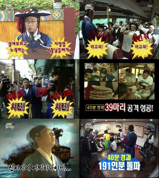 굶겨서 웃기는 시대, 먹여서 웃긴 '무한도전' 그 의미 [OSEN=정덕현의 명랑TV] 리얼 버라이어티쇼에서 가장 중요하고 효과적인 리얼리티의 재료는? 바로 음식이다. '무한도전'은 일찍이 이 음식이 주는 식욕과 굶주림 사이에서 리얼리티를 포착해 큰 웃음을 주었다. '1박2일'의 복불복에서 가장 많이 쓰인 조건은 먹음직한 음식 앞에서 굶는 것이었고, '패밀리가 떴다'는 프로그램 거의 대부분의 시간을 음식을 만들어먹는데 쓴다. 웃음의 포인트도 모두 이 음식과 관련된 것들이 가장 크다. 아무리 설정과 연기를 한다 해도 원초적인 본능을 자극하는 음식 앞에서는 리얼한 반응이 나올 수밖에 없다. 그런데 주로 음식을 활용해 웃음을 주는 방식은 굶기는 쪽이 많았다. 이유는 아마도 여러 가지일 것이다. 과거 '무리한 도전' 시절, 정준하가 우동을 몇 그릇씩 먹어야 하는 미션도 있었지만 배부름이 주는 리얼리티는 어딘지 거북한 면이 있다. 굶주림의 정서가 주는 공감대가 서민들의 정서와 맞닿는 부분도 있을 것이다. 그러나 무엇보다 배고픔이 주는 웃음은 풍요의 시대의 정반대 그림을 그려낸다는 점에서 더 큰 웃음을 줄 수 있을 것이다. 하지만 '무한도전-박명수의 기습공격'편이 선택한 것은 굶주림이 아니라 오히려 먹여서 웃기는 쪽이었다. '서민 경제 살리기'라는 기치를 내건 박명수와 무한도전 멤버들이 기습 공격한 것은 불황에 힘겨워하는 치킨집과 삼겹살집. 불황으로 늘어난 주름과 한숨을 한 방에 날려줄 프로젝트로서 최고 매상을 올려주기 위해 유도부원들과 축구부원들 그리고 개그맨들이 일정 매출 이상 음식을 먹는 미션을 수행했다. 그저 음식점을 찾아가 먹는다면 말 그대로 '서민 경제 살리기' 이벤트 프로그램이 되었을 지도 모른다. 하지만, '무한도전'은 그 상황 자체를 웃음의 코드와 연결시킴으로써 리얼 버라이어티 쇼의 진수를 선보였다. 군사들을 출전시켜 전쟁을 치르는 설정극을 음식 먹어치우기와 연결시켰던 것. 미션을 실패하면 음식 값을 치러줘야 하는 박명수 장군(?)의 진두지휘 하에 음식점에 투입된 군사들(?)은 일사분란하게 치킨과 삼겹살을 먹어 치웠다. 설정극을 차용하자 이 단순할 수 있는 미션은, 배부름에 힘겨워하는 군사들을 독려하고 때때로 무와 음료수를 보급(?)해주는 장면들로 전화되면서 버라이어티한 웃음을 만들어냈다. 이것은 과거 정준하가 우동을 몇 그릇씩 먹던 '무리한 도전'이 주던 거북한 리얼리티와는 사뭇 다른 풍경이다. 그것은 이 '많이 먹는 미션'이 '서민 경제 살리기'라는 의미를 만났기 때문에 가능한 일이다. 많이 먹는다는 것이 아무런 의미를 갖지 못했을 때는 그 도전 자체가 무식하고 거북한 일이 되지만, 그것이 누군가를 돕는다는 차원이 되면 보람 있는 일로 바뀌어진다. 그런 면에서 '무한도전-박명수의 기습공격'편은 음식점에도, 운동부원들에게도, 또 '무한도전'에게도 모두 이득을 남겼다. 음식점은 음식을 팔았고, 운동부원은 실컷 음식을 먹었으며, '무한도전'은 그걸 통해 큰 웃음을 얻었다. 불황에 아끼는 것만큼 중요한 것이 쓰는 것이다. 경제가 살아나기 위해서는 소비가 살아나야 한다. '무한도전'의 공격 대상이었던 치킨집과 삼겹살집이 우리네 서민 경제처럼 보이고, 그들이 먹어치우는 엄청난 양의 치킨과 삼겹살과의 전쟁이 불황과의 전쟁처럼 읽혀지는 것은 왜일까. 굶겨서 웃기는 시대, 먹여서 웃긴 '무한도전'의 웃음이 값지게 받아들여지는 것은 그 때문일 것이다. /정덕현 대중문화 칼럼니스트 mansuri@osen.co.kr 블로그 http://thekian.net/