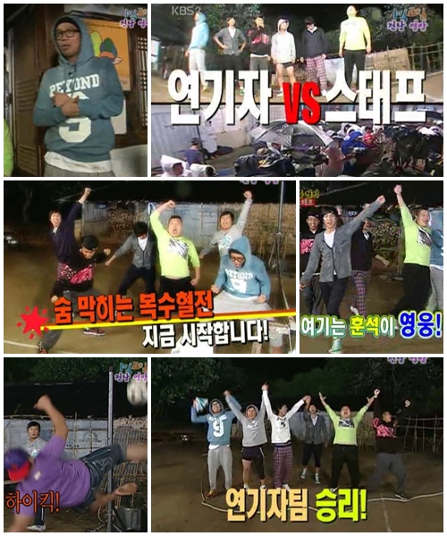 '1박2일'이 넓혀놓은 출연진의 외연, 그 가치 [OSEN=정덕현의 네모난 세상] 전남 영암으로 떠난 '1박2일'에서는 보기 드문 풍경이 연출되었다. PD는 물론이고 매니저, 코디까지 포함한 80여 명의 스태프가 비가 오는 와중에 야외에서 취침을 하게 된 것. 80명의 스태프와 6명의 멤버들이 잠자리를 두고 벌인 복불복 때문이었다. 이 와중에서 큰 웃음을 준 것은 지금껏 복불복으로 야생의 삶(?)을 살아왔던 6명의 멤버가 아니라, 80명의 스태프였다. 여기저기 비가 새는 천막 아래서 스태프는 마치 이산가족처럼 아비규환(?)을 연출했고, 심지어 이명한 PD는 개들이 지냈었다는 헛간 같은 곳에서 자리를 펴고 잠을 자는 모습으로 웃음을 주었다. 이 날 6:80의 대결을 통해 가장 눈에 띄는 것은 대결과정에서 등장한 스태프가 전혀 낯설지 않다는 것이다. MC몽의 매니저인 훈석은 이미 예능인처럼 보였고, 간간이 얼굴을 드러내는 묵찌빠의 달인 지상렬 카메라 감독 역시 반가운 얼굴이었다. 막내 작가인 김대주는 탁구경기에 출전해 역전극을 보여주었고, 뒤늦게 도착한 신입PD 유호진은 벌어진 사태에 넋이 나간 얼굴로 또 몰래카메라가 아닌가 의혹을 품기도 했다. '1박2일'은 경기 중에도 즉석에서 캐릭터를 만들어내는 능력을 보여주었다. 족구 경기에 나온 한 진행팀 요원은 '1박2일' 글로벌 특집에서 출연했던 와프와 닮았다는 이유로 와프로 불렸다. 와프(?)는 다음날 아침 기상미션에서 강호동을 속임으로써 자신이 진 경기에 대한 복수전을 펼쳤다. 나영석 PD는 경기에 진 이후 꽁한 모습을 보여 폭소를 자아내게 했고, 눈 오는 날 복수전을 기약함으로써 겨울에 또 한 번 펼쳐질 스텝들과 멤버들간의 대결을 기대하게 만들었다. 이처럼 모든 스태프가 프로그램 속을 넘나들며 어떤 캐릭터를 형성하는 것은 '1박2일'만이 가진 독특한 힘이 아닐 수 없다. '1박2일'은 친구를 초대해놓고, 또 시청자분들을 초대해놓고 스스로 그들이 놀 수 있는 마당을 제공해준다. 멤버들이 억지로 끌고 나가려하지 않고 출연자의 끼를 끄집어낼 수 있게 해주는 것은 이 프로그램이 가진 미덕이 아닐 수 없다. 이것은 단순한 게스트의 차원을 넘어선다. 찾아간 오지마을에서 보낸 하룻밤만으로 거기 지냈던 분들은 정감 있고 재미있는 캐릭터로 우리들 가슴 속에 각인되곤 한다. 이것은 여행이라는 소재가 가진 힘이기도 하지만, '1박2일'이 유지하고 있는 오픈된 마인드가 가져오는 이 프로그램만의 힘이기도 하다. 시골 어르신들에게서 의외의 정감 있는 모습을 발견하게 하고, 권위를 벗겨버린 PD의 모습을 통해 웃음을 만들어내고, 늘 카메라 뒤편에 서서 고생하는 스태프가 가진 독특한 캐릭터를 발산하게 하며, 시청자들과 동행하며 멤버들 못지않은 끼를 끄집어내주는 것. 이러한 출연진의 외연을 넓히고 다양한 인물들을 만나게 해주는 것은 '1박2일'이라는 프로그램이 왜 앞으로도 무한한 가능성을 기대하게 하는 지를 말해주는 대목이다. 일반인, 스태프, PD까지 그 속에 들어가면 웃음이 되는 곳. 바로 '1박2일'이다. /정덕현 스토리 애널리스트, 칼럼니스트mansuri@osen.co.kr 블로그thekian.net