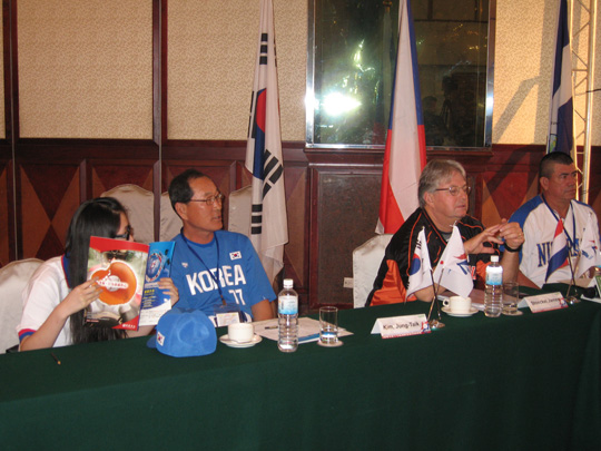 <사진 아래>공식 기자회견장의 한국 대표팀의 김정택 감독(왼쪽). 오른쪽이 예상을 깨고 결승전에 진출한 네덜란드의 제임스 스토에켈 감독이다.