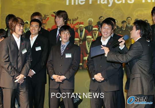 25일 서울 하얏트 호텔에서 열린 2004 푸마 자선축구 경기 전야제에서 김영광(왼쪽 끝)이 사회를 맡은 개그맨 서경석(오른쪽)이 "이운재가 다쳐서 기회를 잡게 되면 좋겠다고 생각해 본 적 없냐"고 묻자 "언제나 운재 형이 함께 있으므로써 배울 게 있어 좋다. 그런 생각은 절대 없다" 고 답해 이운재(오른쪽에서 두번째) 등이 활짝 웃고 있다./손용호 기자(폭탄뉴스.com)