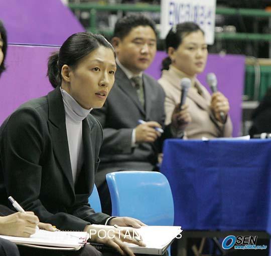 2일 장충체육관에서 벌어진 여자프로농구 겨울리그서 신한은행의 전주원 코치(왼쪽)가 삼성생명과의 경기를 심각한 표정으로 지켜보고 있다. 뒤로 함께 주부선수로 활약하다 은퇴한 정은순(오른쪽)이 장내 해설을 위해 마이크를 잡고 있는 모습이 보인다./손용호 기자(폭탄뉴스.com) [Copyright ⓒ OSEN(www.osen.co.kr) 무단전재 및 재배포 금지]