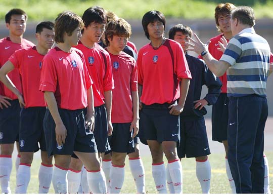 로스앤젤레스에서 전지훈련 중인 본프레레 축구대표팀 감독이 13일(한국시간) 이스트 LA 칼리지 구장에서 가진 연습 도중 선수들을 모아 놓고 설명하고 있다./LA=린다 박 통신원 linda@poctannews.com