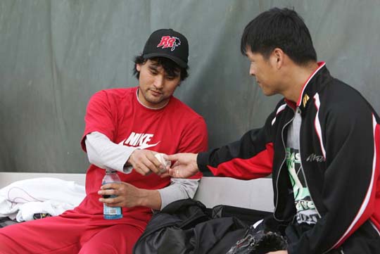 지난 18일(이하 한국시간)부터 로스앤젤레스에서 합동 훈련하고 있는 박찬호(왼쪽)와 구대성이 19일 USC 구장에서 휴식 시간에 그립에 대해 이야기를 나누고 있다./LA=린다 박 통신원 linda@poctannews.com