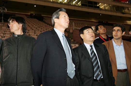 정몽준 대한축구협회장(왼쪽에서 두번째)이 20일 한국-파라과이전에 벌어진 로스앤젤레스 콜러시엄 구장을 찾아 이회택 기술위원장, 홍명보 등과 구장을 둘러보고 있다./LA=린다 박 통신원 linda@poctannews.com