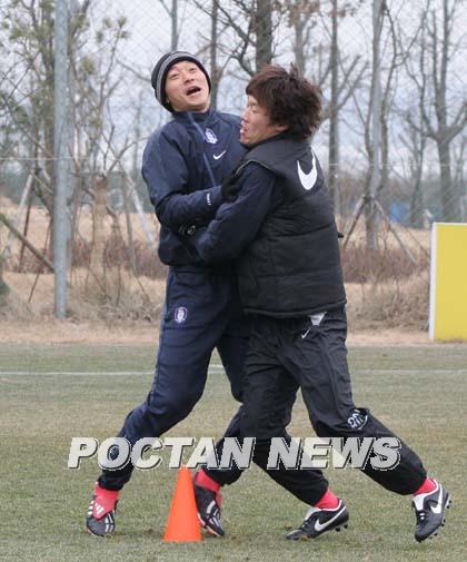 2006 독일월드컵 아시아 최종예선 쿠웨이트전을 이틀 앞둔 한국대표팀이 7일 파주 트레이닝센터에서 오전 훈련을 소화하고 있다. 본격적인 훈련에 앞서 2명이 뛰다 보조 기구의 색깔을 말하면 그쪽으로 가는 게임에서 김남일과 박지성이 방향을 혼동, 맞부딪치고 있다./파주=손용호 기자spjj@poctannews.com (Copyright ⓒ 폭탄뉴스 www.poctannews.com 무단전재 및 재배포 금지)