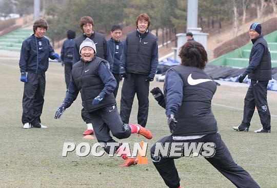2006 독일월드컵 아시아 최종예선 쿠웨이트전을 이틀 앞둔 한국대표팀이 7일 파주 트레이닝센터에서 오전 훈련을 소화하고 있다. 본격적인 훈련에 앞서 2명이 뛰다 보조 기구의 색깔을 말하면 그쪽으로 가는 게임에서 이천수가 여유있게 달려가고 있다./파주=손용호 기자 spjj@poctannews.com (Copyright ⓒ 폭탄뉴스 www.poctannews.com 무단전재 및 재배포 금지)