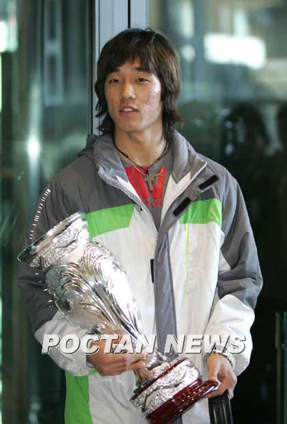 한국 축구의 차세대 골잡이로 각광받고 있는 '득점 기계' 박주영(20.고려대)이 한 달여의 중동 및 스페인 전지훈련을 마치고 11일 오후 귀국했다. 박주영이 카타르 국제 U-21대회 우승컵을 들고 입국장에서 포즈를 취하고 있다./인천=손용호 기자 spjj@poctannews.com (Copyright ⓒ 폭탄뉴스 www.poctannews.com 무단전재 및 재배포 금지)