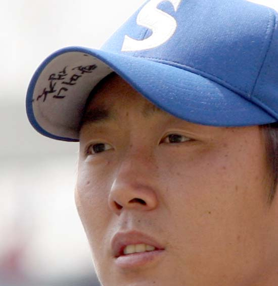 삼성 에이스 배영수가 5일 잠실구장에서 라이벌 LG와의 경기를 지켜보고 있다. 개막일인 지난 2일 완봉승을 거둔 날 밤에 할머니를 여읜 배영수는 모자에 '할머니 생각'이라는 글자를 새겨넣고 슬픔을 달래고 있다. /잠실=손용호 기자 spjj@poctannews.com (Copyright ⓒ 폭탄뉴스 www.poctannews.com 무단전재 및 재배포 금지)