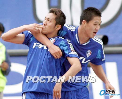수원 삼성이 8일 수원 월드컵경기장에서 벌어진 2005 삼성 하우젠컵 대회 최종일 성남 일화전에서 1-0으로 승리, 지난해 정규리그부터 4개 대회서 연속으로 우승했다. 교체멤버로 들어가 후반 28분 결승골을 낚은 김대의(왼쪽)가 손 키스 세리머니를 펼치고 있다. /수원=손용호 기자spjj@poctannews.com (Copyright ⓒ 폭탄뉴스 www.poctannews.com 무단전재 및 재배포 금지)