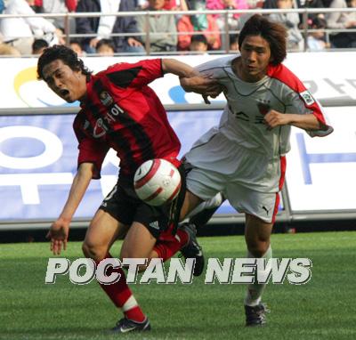 8일 서울 상암 월드컵경기장에서 벌어진 2005 삼성 하우젠컵 대회 최종일 FC 서울과 포항 스틸러스의 경기에서 서울의 박주영(왼쪽)이 오범석과 몸싸움을 벌이다 페널티킥을 얻어내고 있다. 하지만 박주영의 킥은 골키퍼 김병지의 선방에 막혔다./상암=주지영 기자 jj0jj0@poctannews.com (Copyright ⓒ 폭탄뉴스 www.poctannews.com 무단전재 및 재배포 금지)