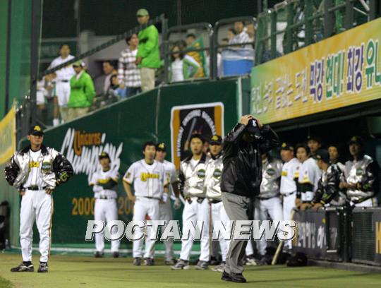 13일 수원 구장에서 벌어진 현대와 삼성의 경기에서 9회말 2사 1루서 2루 땅볼을 친 현대의 강병식을 1루서 아웃으로 판정한 임채섭 심판이 현대 선수단과 팬들의 항의에 머리를 감싸고 심판실로 향하고 있다./수원=주지영 기자 jj0jj0@poctannews.com (Copyright ⓒ 폭탄뉴스 www.poctannews.com 무단전재 및 재배포 금지)
