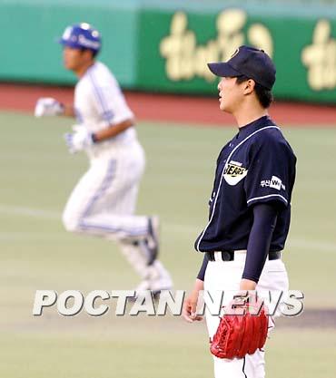 10일 삼성 라이온즈와 두산 베어스의 대구경기 삼성의 2회말 무사 1루 두산의 선발 투수 김명제가 박한이에게 2점 홈런을 맞은 뒤 공이 넘어간 쪽을 쳐다보고 있다. 김명제는 1회 세 타자를 내리 삼진으로 잡으며 쾌조의 스타트를 끊었으나 4⅔이닝동안 8피안타 6실점으로 난조를 보이고 물러났다./대구=손용호 기자 spjj@poctannews.com (Copyright ⓒ 폭탄뉴스 www.poctannews.com 무단전재 및 재배포 금지)