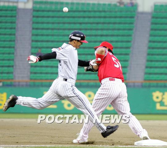 11일 LG 트윈스와 한화 이글스의 잠실경기 LG의 1회말 1사 후 한규식이 2루수 쪽 땅볼 타구를 친 뒤 한화 1루수 김태균이 송구를 잡지 못하는 사이 베이스에 먼저 들어가고 있다. 내야 안타로 기록됐다. /잠실=주지영 기자 jj0jj0@poctannews.com (Copyright ⓒ 폭탄뉴스 www.poctannews.com 무단전재 및 재배포 금지)