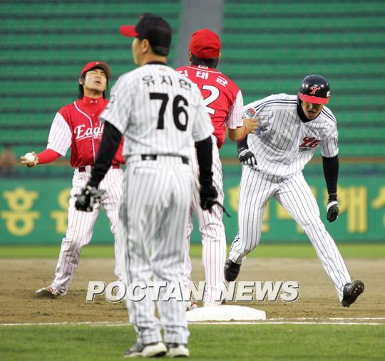 11일 LG 트윈스와 한화 이글스의 잠실경기 LG의 1회말 2사 1,3루 클리어 타석 때 2루 도루를 시도하다 되돌아간 1루 주자 박용택을 쫓아오다 잡아내지 못한 한화 2루수 고지행(왼쪽)이 아쉬워 하고 있다. 이 사이 3루 주자 마테오가 홈을 파고 들어 득점에 성공했다./잠실=주지영 기자 jj0jj0@poctannews.com (Copyright ⓒ 폭탄뉴스 www.poctannews.com 무단전재 및 재배포 금지)