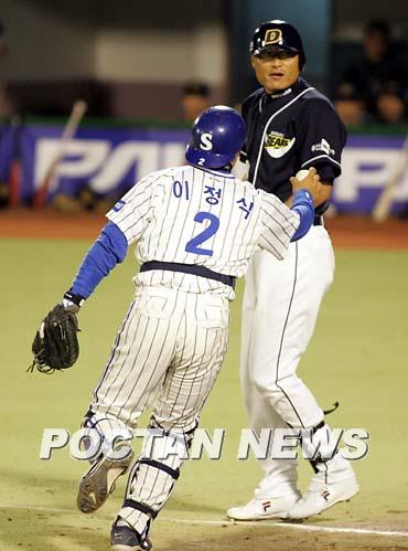 10일 삼성 라이온즈와 두산 베어스의 대구경기 5회초 2사 후 두산의 문희성이 친 타구가 홈플레이트 근처를 튕기자 삼성 포수 이정식이 잽싸게 잡아 태그 아웃시키고 있다. 문희성은 파울이라는 듯 가만히 서 있다./대구=손용호 기자 spjj@poctannews.com (Copyright ⓒ 폭탄뉴스 www.poctannews.com 무단전재 및 재배포 금지)