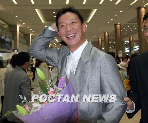 미국 유학 중 공석이던 전주 KCC 감독으로 선임된 '농구 대통령' 허재 전 원주 TG삼보 플레잉코치가 17일 오후 인천공항을 통해 급거 귀국했다. 허재 감독이 마중 나온 사람들의 축하 인사에 쑥스러워하는 표정을 짓고 있다. /인천공항=손용호 기자 spjj@poctannews.com (Copyright ⓒ 폭탄뉴스 www.poctannews.com 무단전재 및 재배포 금지)
