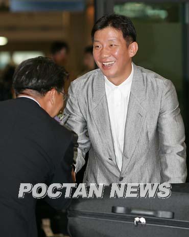 미국 유학 중 공석이던 전주 KCC 감독으로 선임된 '농구 대통령' 허재 전 원주 TG삼보 플레잉코치가 17일 오후 인천공항을 통해 급거 귀국했다. 허재 감독이 마중 나온 김재욱 전주 KCC 사무국장과 인사를 나누고 있다./인천공항=손용호 기자 spjj@poctannews.com (Copyright ⓒ 폭탄뉴스 www.poctannews.com 무단전재 및 재배포 금지)