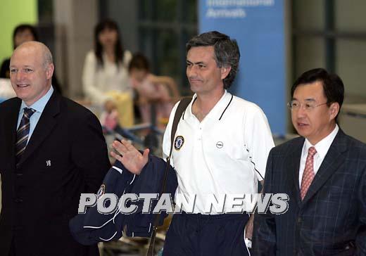 오는 20일 수원 월드컵경기장에서 수원 삼성과 친선 경기를 가질 잉글랜드 프리미어리그 챔피언 첼시가 18일 오후 입국했다. 조세 무링요 감독(가운데)이 입국장을 나서며 팬들에게 손을 흔들어 인사를 하고 있다. /인천공항=손용호 기자 spjj@poctannews.com (Copyright ⓒ 폭탄뉴스 www.poctannews.com 무단전재 및 재배포 금지)