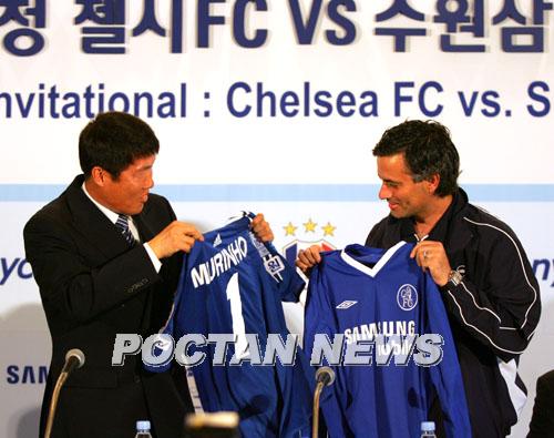 19일 오전 서울 신라호텔에서 열린 차범근 수원 삼성 감독과 조세 무링요 첼시 감독의 기자회견에 앞서 두 사람이 양 팀의 유니폼을 교환하고 있다. 차범근 감독은 등쪽에 '1' 자와 영어로 '무링요'라고 적은 수원 유니폼을 준비해 나왔다./주지영 기자 jj0jj0@poctannews.conm (Copyright ⓒ 폭탄뉴스 www.poctannews.com 무단전재 및 재배포 금지)