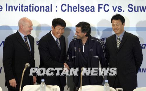 19일 오전 서울 신라호텔에서 열린 수원 삼성과 첼시의 공동 기자회견이 열렸다. 기자회견에 앞서 인사를 나눈 조세 무링요 첼시 감독(오른쪽에서 두 번째)가 피터 케년 첼시 사장(왼쪽)과 차범근 수원 감독에게 먼저 앉기를 권하고 있다. 오른쪽은 수원 선수 대표로 참석한 골키퍼 이운재./주지영 기자jj0jj0@poctannews.conm (Copyright ⓒ 폭탄뉴스 www.poctannews.com 무단전재 및 재배포 금지)