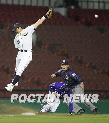 19일 두산 베어스와 SK 와이번스의 잠실경기 SK의 5회초 1사 1,2루서 3루 도루를 시도한 2루 주자 조원으로 잡기 위해 던진 두산 포수 홍성흔의 송구가 김동주가 점프해도 잡을 수 없을 정도로 높아 좌익수 쪽으로 빠지고 있다./잠실=손용호 기자 spjj@poctannews.com (Copyright ⓒ 폭탄뉴스 www.poctannews.com 무단전재 및 재배포 금지)