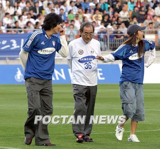20일 수원 월드컵경기장에서 벌어진 잉글랜드 프리미어리그 2004~2005시즌 챔피언 첼시와 수원 삼성의 친선경기에 앞서 시축을 마친 인기 가수 이효리(오른쪽)와 탤런트 권상우(왼쪽)가 윤종용 삼성전자 대표이사 부회장과 함께 그라운드 밖으로 걸어 나오고 있다./수원=손용호 기자spjj@poctannews.com (Copyright ⓒ 폭탄뉴스 www.poctannews.com 무단전재 및 재배포 금지)