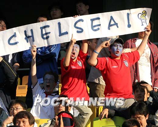 20일 수원 월드컵경기장에서 벌어진 잉글랜드 프리미어리그 2004~2005시즌 챔피언 첼시와 수원 삼성의 친선 경기를 관전하는 소년 팬들이 얼굴에 페이스 페인팅을 하고 '첼시' 라고 쓴 플래카드를 들고 응원하고 있다./수원=손용호 기자 spjj@poctannews.com (Copyright ⓒ 폭탄뉴스 www.poctannews.com 무단전재 및 재배포 금지)