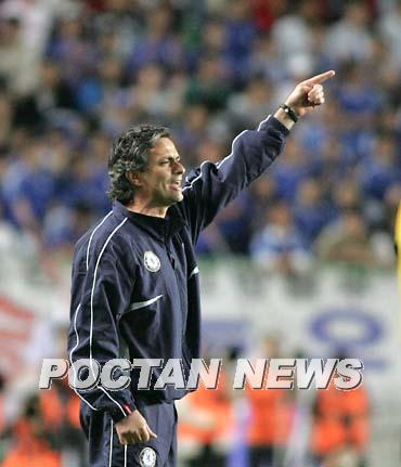 20일 수원 월드컵경기장에서 벌어진 잉글랜드 프리미어리그 2004~2005시즌 챔피언 첼시와 수원 삼성의 친선경기서 후반 첼시가 일방적으로 밀리자 조세 무링요 감독이 터치 라인 부근까지 나와 작전을 지시하고 있다./수원=손용호 기자 spjj@poctannews.com (Copyright ⓒ 폭탄뉴스 www.poctannews.com 무단전재 및 재배포 금지)